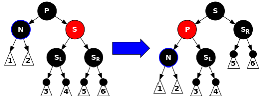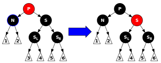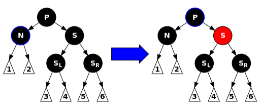 출처: https://ko.wikipedia.org/wiki/%EB%A0%88%EB%93%9C-%EB%B8%94%EB%9E%99_%ED%8A%B8%EB%A6%AC#%EC%82%AD%EC%A0%9C(Removal) 이는 S를 지나는 경로의 블랙 노드 개수에는 영향을 주지 않지만, N을 지나는 경로에 블랙 노드 개수를 1개 증가한다. 이를 통해 양쪽의 블랙 노드 개수가 균형을 이룬다.