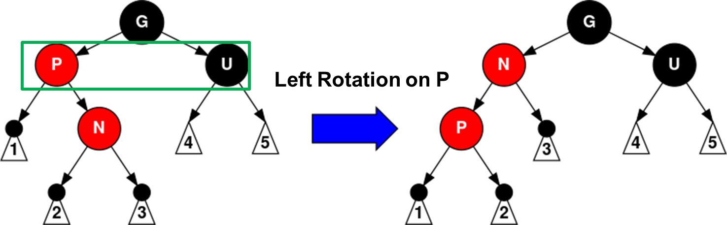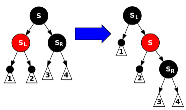 S가 레드일 경우 P는 무조건 블랙이다(조건 4). 이 경우 P와 S의 색을 바꾸고 P에서 왼쪽으로 회전한다.