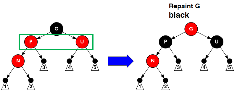 N이 추가되기 이전에 G 서브 트리의 블랙 노드 갯수는 2개이다. N을 추가하고 P, U를 블랙으로 변경하면 G 서브 트리의 블랙 노드 갯수는 3개가 된다. 이는 조건 5가 위배되기 때문에 G 노드의 색상을 레드로 변경해 조건 5를 충족한다.
