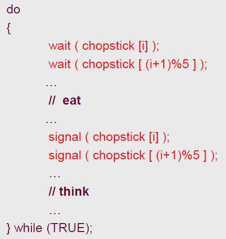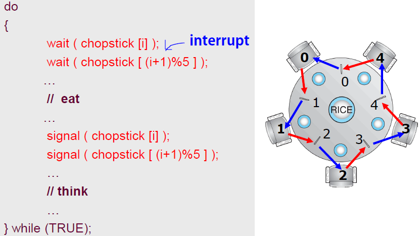 위와 같이 wait() 다음 interrupt가 발생한다면 모든 사람이 본인 왼쪽의 젓가락을 점유한 채 오른쪽의 젓가락을 영원히 기다릴 것이다.