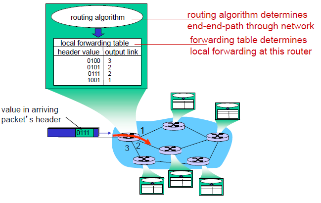 포워딩은 라우터로 들어온 패킷을 적절한 아웃풋 링크로 보내는 역할을 한다. 포워딩은 라우터별로 일어나며, forwarding table을 사용하여 행해진다.