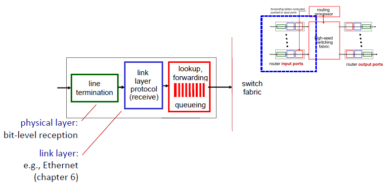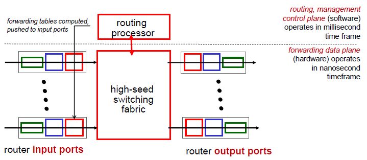 앞선 포스팅에서 말한 것과 같이 라우터는 두가지 기능을 한다. 하나는 routing algorithm을 수행하여 출발지에서 도착지까지 패킷의 route(전체 경로)를 결정하는 routing, 다른 하나는 라우터로 들어온 패킷을 적절한 아웃풋 링크로 보내는 forwarding이다.