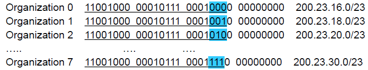 ISP-A가 200.23.16.0/20의 IP 주소 블록을 샀고 8개의 조직에 동일하게 주소를 할당했다고 가정해보자.
