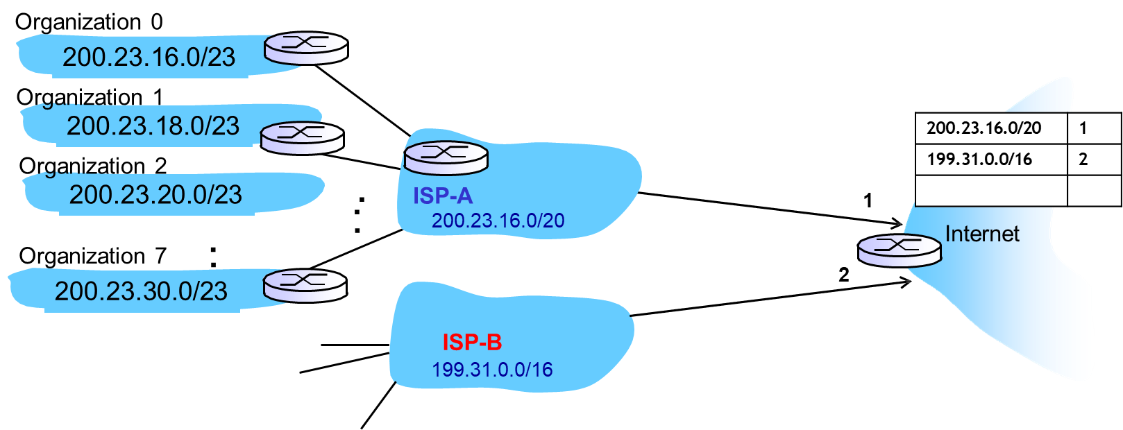 이때 만약 ISP-A가 ISP-B를 사서 Organization 1을 ISP-B로 옮기게 된다면 다음과 같이 라우터의 forwarding table이 수정될 것이다.