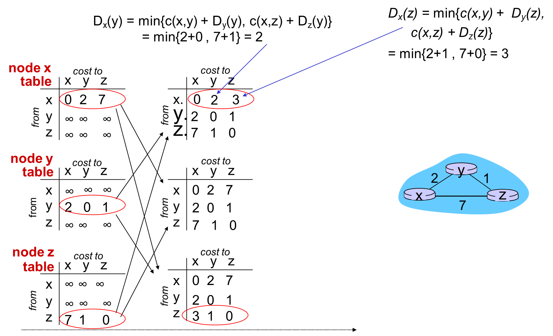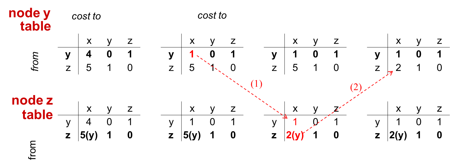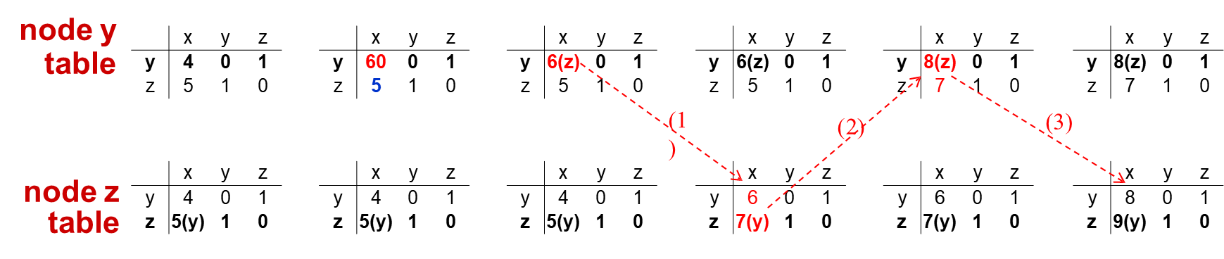 라우터 y는 DV를 다시 계산하고 DV를 x와 z에게 전달한다. y의 DV를 받은 z는 DV를 수정하고 이웃한 x, y에게 전달한다. 이후 어떤 라우터의 DV도 변화가 없기 때문에 일을 종료한다.