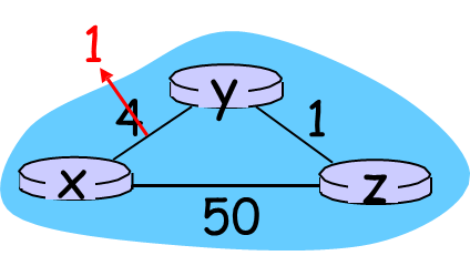 만약 위의 예시와 같이 z 라우터가 y를 거쳐 x로 가는 것이 최소 비용 경로라면, z는 y에게 z에서 x로 가는 경로는 무한대의 비용이 발생한다라고 전달한다.