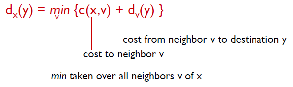 x에서 y로 가는 최소 비용 경로(dx(y))는 x와 이웃한 모든 정점 v에서 y로 가는 최소 비용 + x에서 v로 가는 최소 비용의 최솟값이다.