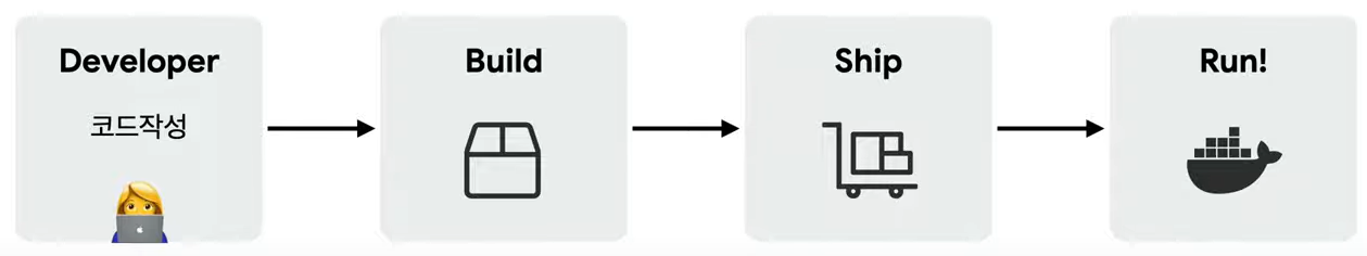 개발자가 코드를 작성하고 도커 이미지를 만들고(Build) 만든 이미지를 도커 허브나 저장소에 저장하고(Ship) 도커 이미지를 컨테이너로 실행(Run)한다.