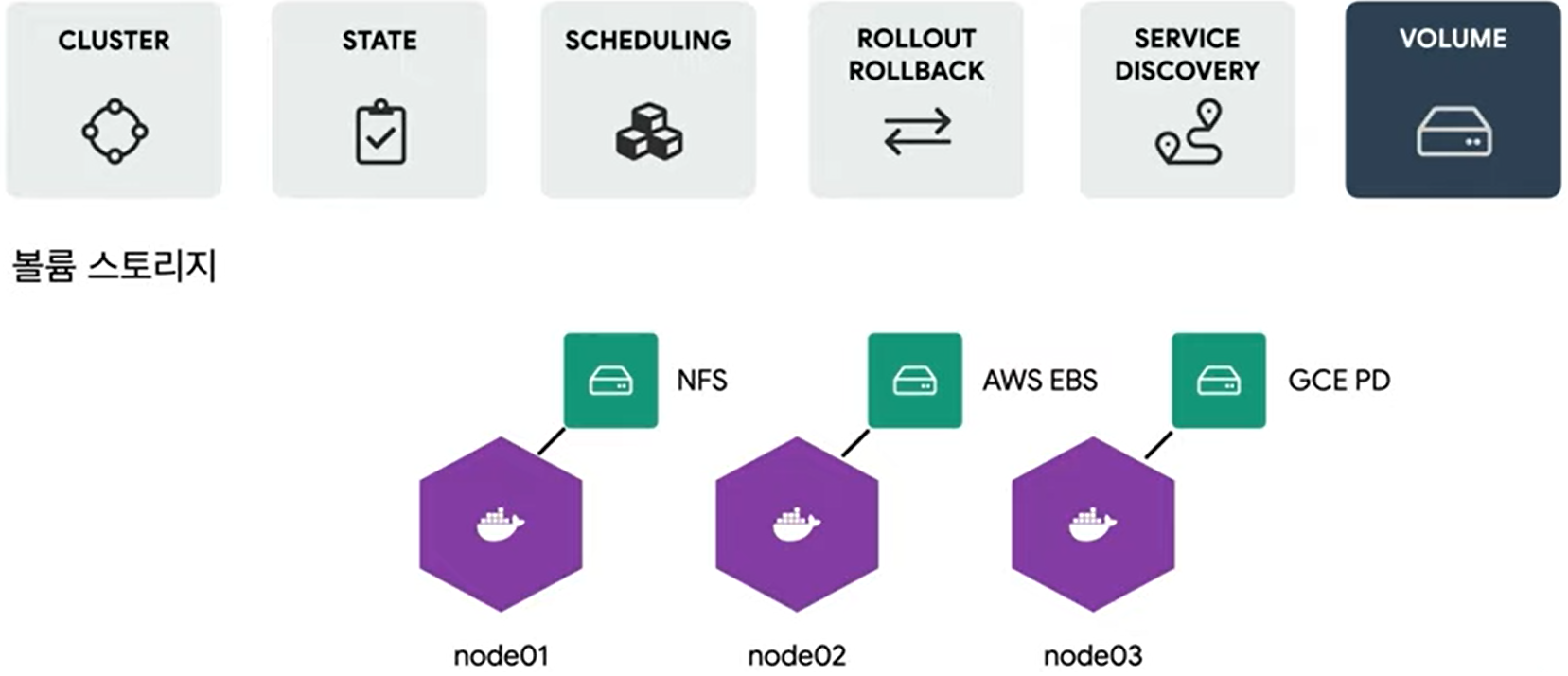 출처: https://www.youtube.com/watch?v=Ia8IfowgU7s&list=PLIUCBpK1dpsNf1m-2kiosmfn2nXfljQgb&index=2 - 각 노드에 필요한 볼륨을 설정으로 쉽게 마운트할 수 있음