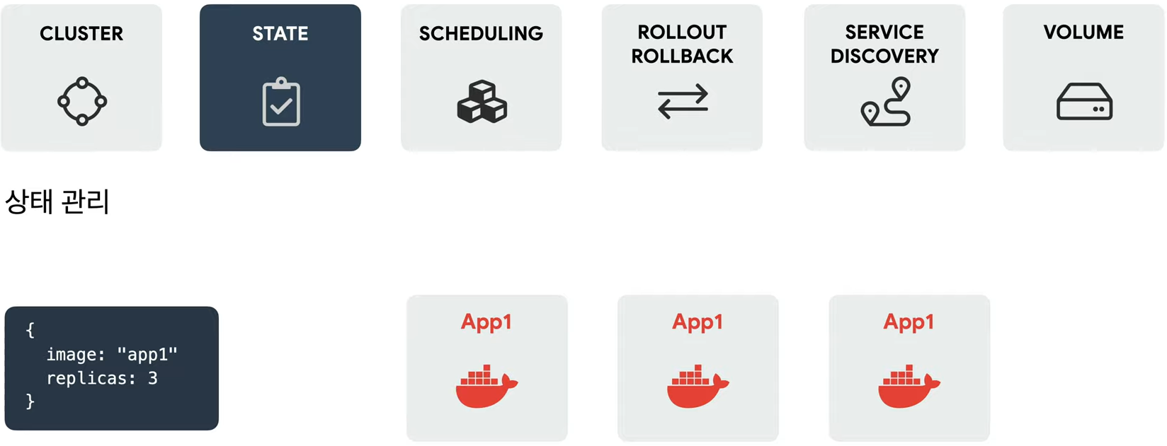 출처: https://www.youtube.com/watch?v=Ia8IfowgU7s&list=PLIUCBpK1dpsNf1m-2kiosmfn2nXfljQgb&index=2 - 컨테이너 오케스트레이션이 관리자가 원하는 상태(Desired state)에 맞춰 자동으로 상태를 관리할 수 있음