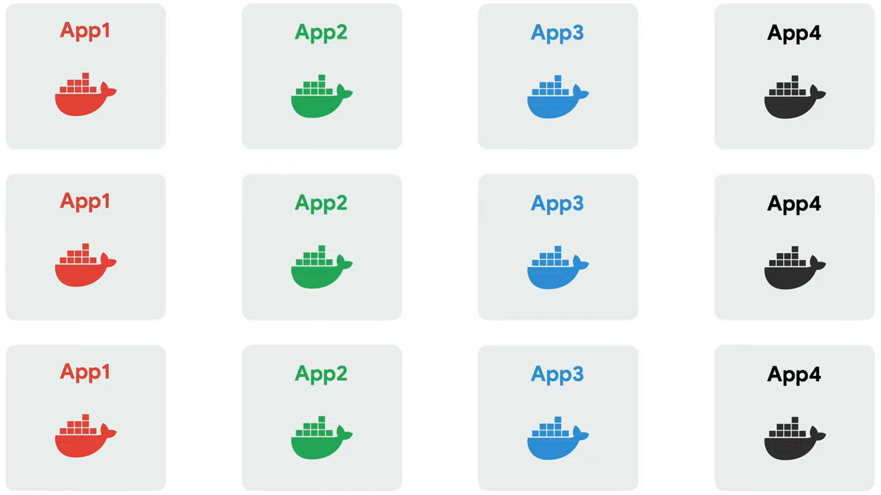 출처: https://www.youtube.com/watch?v=Ia8IfowgU7s&list=PLIUCBpK1dpsNf1m-2kiosmfn2nXfljQgb&index=2 이 4개의 앱의 사용량이 점점 늘어나게 되어 부하가 많아지게 된다면 컨테이너 수를 늘려 부하를 분산할 것이다.