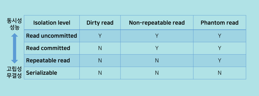 출처: https://hleee.medium.com/%EA%B2%A9%EB%A6%AC-%EC%88%98%EC%A4%80-3287d4bcc64d 아래로 내려갈수록 Isolation과 Consistency는 높아지고 Concurrency과 Throuput은 떨어진다.