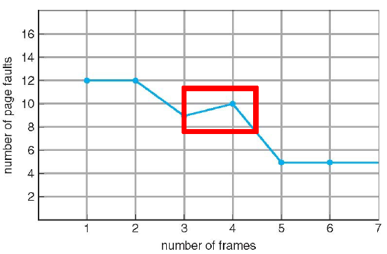 - Belady's anomaly: 페이지 프레임 수를 늘려도 되려 page fault가 더 많이 발생하는 모순이 존재한다.