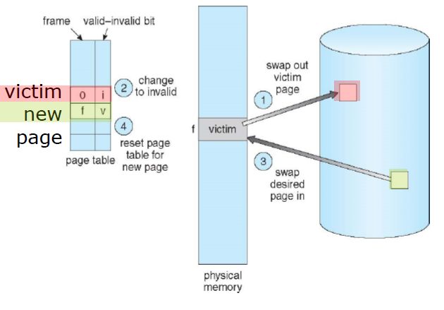프로세스가 page를 참조할 때 page fault가 발생하게 되면, OS는 메모리에서 빈 프레임 찾아 원하는 페이지를 빈 프레임에 로드한다. 이때 만약 메모리에 빈 프레임이 없다면, 사용하지 않는 페이지를 찾아 디스크로 내보내야 한다.